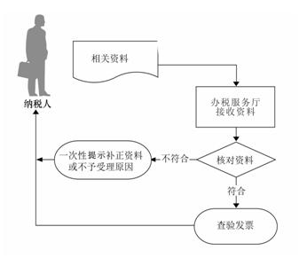 1)办税服务厅接收资料,核对纳税人报送资料是否齐全、是否符合法定形式,符合的即时办结;不符合的当场一次性提示纳税人应补正资料或不予受理原因。